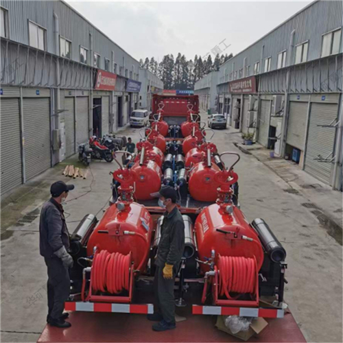 移動干粉滅火裝置,以高壓氮?dú)鉃閯恿Γ瑢迌?nèi)干粉滅火劑通過干粉炮或干粉槍噴向保護(hù)對象,由于干粉的比重較大,在氣流的作用下能覆蓋到火上不致被氣流沖散。干粉在火焰的作用下破壞了原有的結(jié)晶,以新的化學(xué)物質(zhì)中斷了燃燒的鏈?zhǔn)椒磻?yīng),窒息火焰,同時(shí)干粉在分解過程中大量吸熱,使著火區(qū)域溫度迅速下降,從而控制撲滅火災(zāi)。